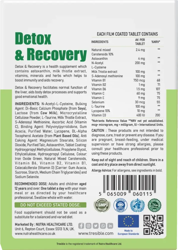 <div class=”"”product_page_nutritional-pa<p”>INGREDIENTS: INGREDIENTS: N-Acetyl-L-Cysteine, Bulking Agent: Di-Basic Calcium Phosphate (from Soya), Lactose (from Cow Milk), Microcrystalline Cellulose Powder, L-Taurine, Milk Thistle Extract, S-AdenosylMethionine, Ascorbic Acid (Vitamin C), Binding Agent: Polyvinylpyrrolidone, Gum Acacia, Purified Water, Lycopene, DL-Alpha Tocopherol Acetate (from Plant Based Oils), Anti Caking Agent: Magnesium Stearate, Silicon Dioxide, Purified Talc, Astaxanthin, Tablet Coating: Hydroxypropyl Methylcellulose, Propylene Glycol, Ethylcellulose, Hydroxypropyl Cellulose, Colour. Iron Oxide Green, Natural Mixed Carotenoids, Vitamin B6, Vitamin B2, Vitamin B1, Colecalciferole (Vitamin D) Carrier: Gum Acacia, Sucrose, Starch, Medium Chain Triglycerides] and Sodium Selenite.