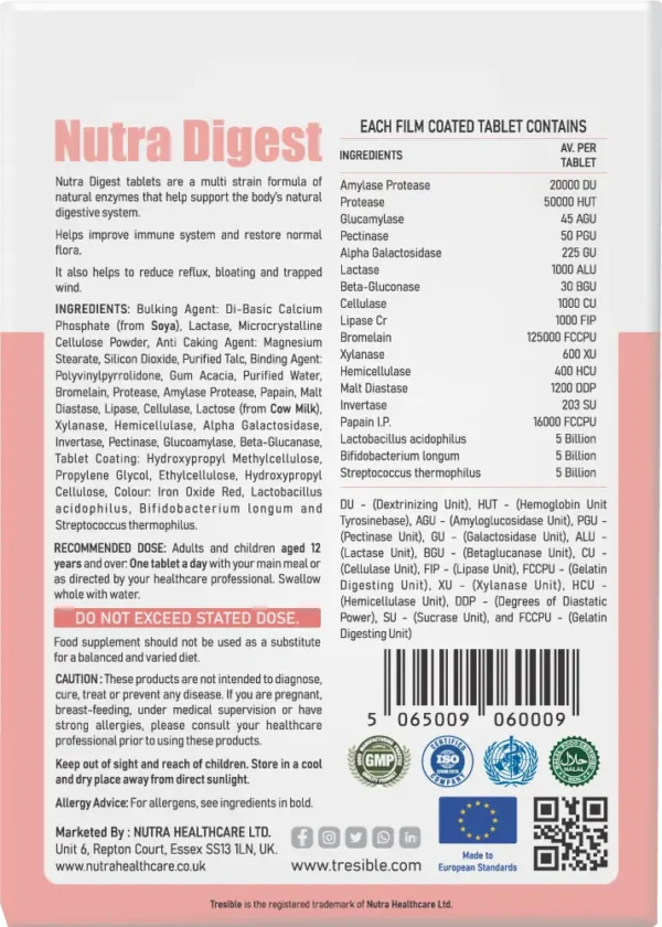 INGREDIENTS: Bulking Agent: Di-Basic Calcium Phosphate (from Soya), Lactase, Microcrystalline Cellulose Powder, Anti Caking Agent: Magnesium Stearate, Silicon Dioxide, Purified Talc, Binding Agent: Polyvinylpyrrolidone, Gum Acacia, Purified Water, Bromelain, Protease, Amylase Protease, Papain, Malt Diastase, Lipase, Cellulase, Lactose (from Cow Milk), Xylanase, Hemicellulase, Alpha Galactosidase, Invertase, Pectinase, Glucoamylase, Beta-Glucanase, Tablet Coating: Hydroxypropyl Methylcellulose, Propylene Glycol, Ethylcellulose, Hydroxypropyl Cellulose, Colour: Iron Oxide Red, Lactobacillus acidophilus, Bifidobacterium longum and Streptococcus thermophilus.